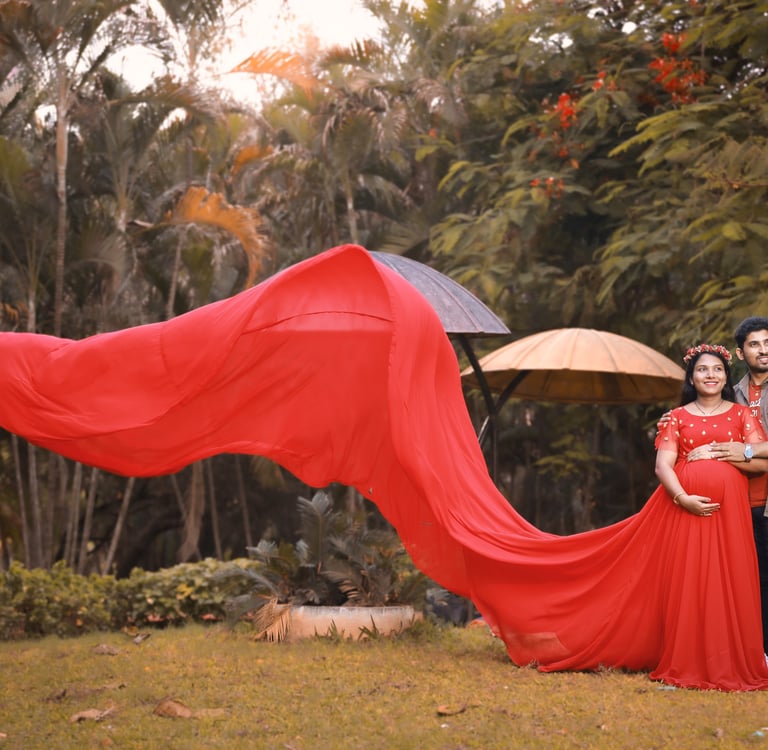 We offer both studio and outdoor maternity sessions based on your preference. Our professional maternity studio in Vizag is equipped with designer gowns, soft-lit backdrops, floral themes, and luxury portraits that bring a magazine-style look to your photos. If you love nature-inspired memories, our outdoor maternity shoot Vizag options include beaches, parks, hilltops, and serene sunrise viewpoints that add natural charm and cinematic depth to your portraits. Every location, angle, and pose is thoughtfully planned to make your pregnancy glow shine with beauty.