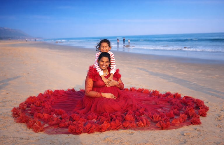 Beach maternity photography at scenic Vizag locations like RK Beach, Rushikonda, Yarada.